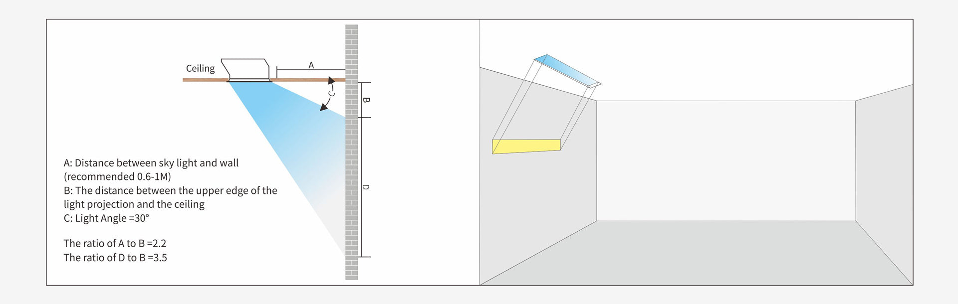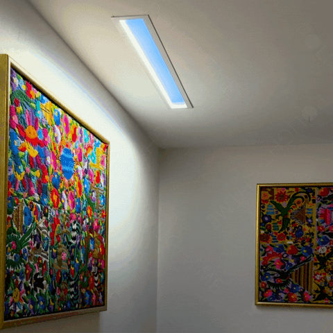The L-Series (140x1150) model is a unique, linear lighting system that functions as a "wall washer" effect. Its elongated shape is ideal for creating long strips of natural light along walls, giving the illusion of a prolonged window just below the ceiling. This is an excellent choice to bring Your Private Sun into modern, minimalist interiors.